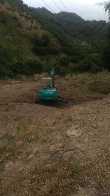 雨模様だったが午前中行司が谷の東斜面の草刈り。東斜面と西斜面の間の谷底部に紅マドンナの苗木を植えていて今年から収穫できると楽しみにしていたのだが、昨年の西日本豪雨災害でやられて大半が流されてしまった。東斜面に大規模ながけ崩れがおきて竹藪が畑の端まで突っ込んできており、大量の水が上から流れたために園地に深さ1m程度の谷ができている。ようやく園地の原形復旧のために三光工業さんのユンボが到着、作業を開始してくれた。宇和島市から費用の9割の補助金支給がある。有難い。来年3月には新たに苗木を植えるつもりだ。