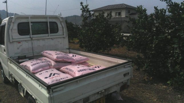 午前中、新田の肥料撒き。草刈りあとなので肥料撒きも気持ちがいい。有機配合肥料9-4-4を30アールに20袋撒いた。9-4-4の意味はチッソ、リン酸、カリのパーセンテージ。一袋20kgなので20×20×9%でチッソ量では36kg。30アールなので、10アールで言えば12kg。ここに植えている河内晩柑の年間施肥量の農協推奨値が44kg/10アールなのでおよそ1/3から1/4だ。4月にも撒いているのでおよそ半分は撒いている。液肥も撒いているのでこれくらいにしておく。(経費の関係もある)