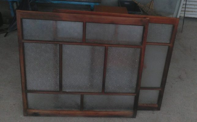 昨日のうちに雑巾とマイペットで掃除しておいて、乾いていたところに荏油を布切れに少し浸して塗り込んでいった。白っぽかったところが色が濃くなり、艶がでてきた。光沢のある塗料を塗るよりレトロ感があっていいと思う。塗り終わって少し乾かしたあと、ガラスをはめこんだ。