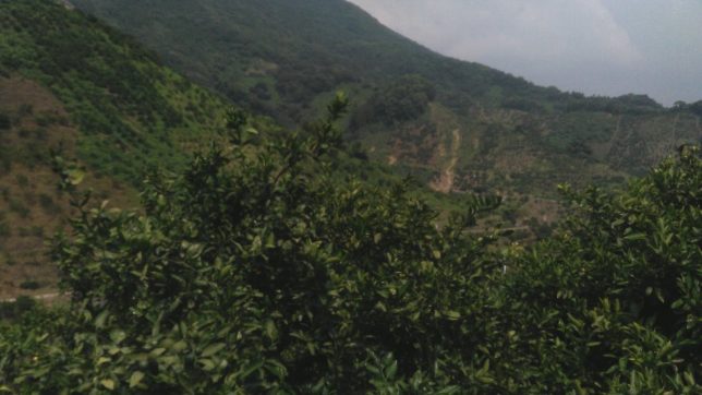 そろそろ第3回目の黒点の農薬散布を行う時期だ。朝から準備していたのだが、天気予報は雨マークがついていて、準備が終ってトラックのタンクに水を貯めようとしているとき雨がパラパラ。農薬散布は中止した。結局夜まで雨は降らなかったのだが。というわけで、農薬散布の前に園地を巡回することに。シオカラ地区の大津4号の園地でミカンの木にヘクソカズラがおおいかぶさっているのを発見。小一時間かけて取り除いた。ヘクソカズラだけではなく、野ブドウらしきのもいる(右の奥のほう)。