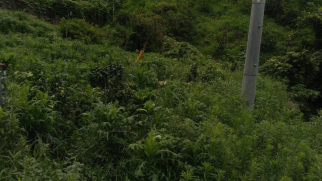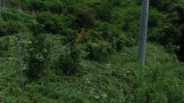 もう一か所は、行司が谷の紅マドンナ畑で、昨年の豪雨災害で生き残ったところ。あっという間に背丈近く雑草が伸びている。豪雨で石ころや木がごろごろしているので、あまりキレイには枯れない。あとで除草剤を撒くつもりで、いわゆる高刈りにした。