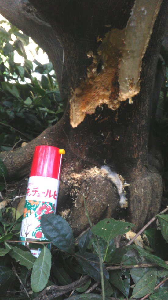 梅雨明け、二日目。ジメジメした梅雨が終って、暑いけれど爽快な感じ。昨日の続きの行司が谷の除草だが、少し考えて除草剤を使うことにした。メヒシバの下に生えている白クローバはもったいないが、草刈り機だと半日×2日かかってしまう。時間、体力、他の仕事も考えて、結局除草剤を撒くことに。2時間かからずに終了。10時過ぎに終わって、同じ行司が谷に1本ある伊予柑の木にかぶさっていた葛(くず)の処理を行った。終ってやれやれと思ったが、根本にゴマダラカミキリの侵入跡(おがくず)を発見。剪定ばさみで侵入跡を追跡して、柔らかくなっている表皮を剝いでいき、幼虫を探したが、見つからない。下の写真の真ん中あたりの黒くなっているところから内部に侵入したようだ。