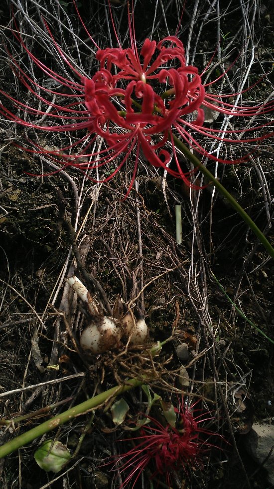 昨日はカメムシ防除と極早生の防腐剤散布だった。今日は残るコークボ園地(極早生)の防腐剤散布と片づけを10時ごろまで。そのあとは、先日草刈りをした宮の谷園地(早生)の摘果作業を夕方まで。宮の谷園地の半分が終了した。今日の一枚は宮の谷園地に生えていたヒガンバナと掘り出した球根。