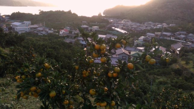 午前、午後と寺のウネ(早生)園地の草刈り。1日かかって三分の二ほど終了。ここは我が園地の中でも海が見えて眺めがいいところだ。早生ミカンがかなり色づいてきている。夕陽が山影に隠れたところで写真をとった。