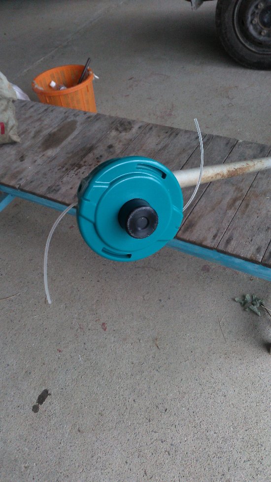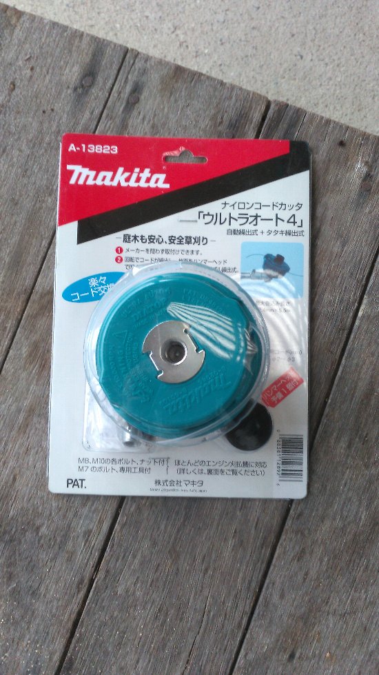 ナイロンコードは使っていると減って短くなり切れなくなるので、あらかじめ20cmくらいに切っておいたコードを15分に1回くらい交換していたが、これは5m以上のナイロンコードを中に収納しておいてそれが自動で出てくる優れもの。特許らしいが、これを発明した人はすごい。実際に午後使ってみたがなかなかいい。長さは自動的に調整されるのだが、真ん中の黒いボッチを回転中に地面にたたきつけるとコードが伸びてくる機能もいい。いまのところ合格だ。