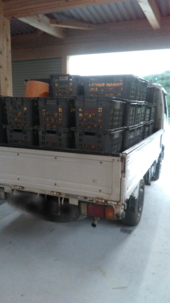 早生ミカンの収獲二日目。玉津柑橘倶楽部にアルバイターさんを頼んでいたら、4人きてもらった。そのうち3人は摘果の時に来てもらった小杉さん、鈴木さん、黒木さんだ。今日収穫する場所は3人に摘果をお願いした場所で、不思議な縁は続いている。残る一人は二十歳の久保田君。高校の級友二人も含めて午前中は10人でミカン採り。午前中にシオカラ地区の道上部分がほぼ終了。午後は都合で二人減ったが8人で行司が谷の東斜面の早生ミカンの収獲。今日の収獲は午前、午後合わせてコンテナ153杯だった。順調もいいところ。今回はアルバイターさんの写真を撮るのを忘れてしまった。代わりにトラックの写真でも。