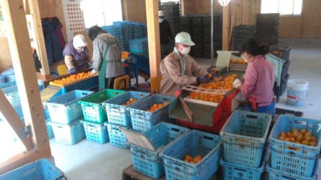午前中は行司が谷の早生のミカン採りの続き。コンテナ50杯ほど収穫して終了。あと6本ほど残った。午後は撰果作業。6人で2台の撰果機を使って、精品、可品、格外、加工、腐りに分別していった。撰果機が2台あれば撰果のスピードは2倍になる。