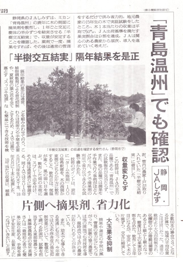 今日は宮ノ谷園地のミカン採り。一昨日に続いて二日目。今日夕方でほぼ園地の半分が終了。この園地は隔年結果が強いのは一昨日のブログで述べた。なんとか隔年結果を改善しようと、今年は日本農業新聞に昨年載っていた「半樹交互結実法」の記事を参考にして、今年はこの園地ともう一か所南柑20号の園地にこの方法を適用している。こういう実験が好きだ。内容を要約すると、隔年結果(2年に一回しか実が生らない)を改善するために生り年にミカンの木の半分に摘果剤を撒いて実を落とし、半分ごとに実を生らそうというもの。摘果剤散布時期にターム(摘果剤)の1000倍溶液を木の半分にかけるだけ。従来ある刈り上げ剪定法(木の半分の主枝の小枝を剪定で落としてしまう)に比べていたって簡単だ。
