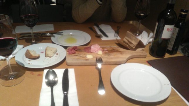そのあと呑み助3人でおなじ地下街のおしゃれなワインバーに行った。ちょっと高級なワイン、チーズ、パンやハムがおいしかった。