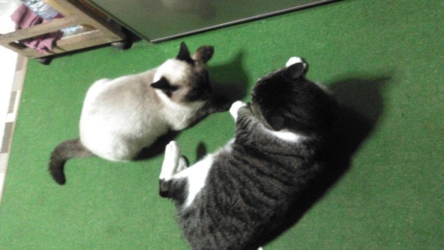 朝一番で、紙のゴミ出しや灯油の買い出しなど家事のお手伝い。そのあと、デコポン、甘平、モロ(ブラッドオレンジ)の分析用の果実を3個づつ採集して共撰の指導部に提出した。そのあとは昨日の続きで、清美の園地のネット掛けの準備をした。支柱を補強したり、パイプの上につけているペットボトルを交換したりして結構時間がかかった。夕方6時半からは玉津地区の農地再編事業の集会に参加。結局書類にハンコを押すのと簡単な説明のみ。お役人のペースになってきている。帰ってきたらジジとココがじゃれあっていたので写真を。