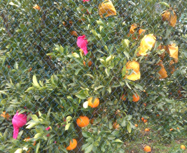 今日の仕事は終了。お楽しみの実験を一つ。1本だけ収穫してないデコポンが清美の防鳥ネットの中にある。その木の実に、サンテをかけたもの、袋をかけたもの(紙袋で袋についた針金で口を縛る)、そのままのものの3種類の状態で3月中旬までおいておき、昨日までに収穫して貯蔵したのと味や外観を比較してみようと思っている。どうなるか楽しみ。