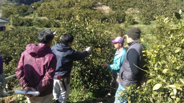 午前中は昨夜までの雨が残っていたので農作業は中止。頼まれていた甘平の荷造りと発送をした。午後は玉津共撰主催の剪定講習会に参加。極早生、甘平、早生、デコポン、ポンカンの剪定について各園地で指導員が実際に剪定をやってくれた。デコポンはお寺の前の我が園地で実施。すでに剪定は終わっていたので、みんなで剪定の品評会になった。特にダメ出しはなかった。というか、最近では剪定を毎年する農家はすくないようだ。すでに剪定が終っているだけで驚かれたが・・・。