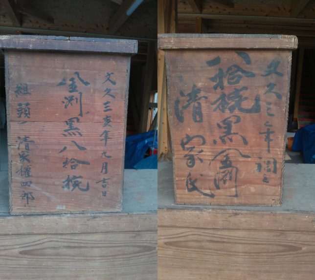 文久三年亥年、清家権四郎と書いてある。清家権四郎家は曾祖母の実家。長持の裏にも墨書きがあった。曾祖母が嫁いできたのは1892年。文久三年は1863年だからこれを購入したのは嫁入りの約30年前ということになる。たぶん嫁入りの時に実家から持ってきたものだと思われる。左の字は長持ちに書いてあった字と筆跡が同じようだ。中身はこちら。鑑定団に出せるかも。