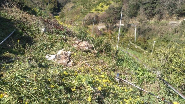 1昨年の豪雨災害で、上の園地の石垣が崩れてきて土砂が押し寄せてきている。いっしょにどっかから古いビニールハウスのビニールも流れてきている。放っておいたのだが、苗木を植えるにあたり、きれいにしたいと思っている。明日も続く。