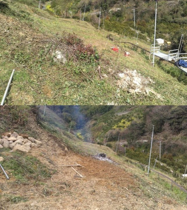 作業後の写真の左側にあるのが出てきた石だ。生えていた木やハウス用のビニールなども押し寄せてきていた。なんとか午後3時ごろまでに片づけが終了。燃やせるものはすぐ奥で燃やした。そのあと、園地の一番下側に細い竹が繁茂してきていてスプリンクラーの支柱も竹に囲まれる状態だったので伐採した。残している部分は他の人の土地なのだ。