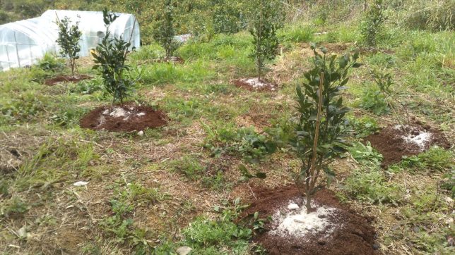 朝から風が強く、割と寒い日だった。朝一番で昨日収穫した分と残っていたデコポンを出荷した。そのあとは去年の春、家のすぐ裏に植えた20本ほどの甘平の苗木に先日もらった牛糞堆肥を株元にまいた。堆肥は肥料としてじっくり効いてくれる、株元に雑草が生えにくい、保湿効果があり乾燥しにくいなどのメリットがある。下の写真で白いのは堆肥の上から撒いた化成肥料だ。