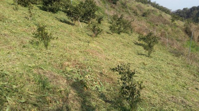 級友たちに大好評の甘平だが、行司が谷の場合大きく育ってくれたのは半分くらいだ。ここは就農して最初に改植したところだがせっかく植えた苗木を草刈り機で切ってしまったり、ゴマダラカミキリムシにやられたりしてまともに育ったのは半分くらいだ。あとは毎年少しづつ植え足している。今年も植えるつもりで苗木を頼んだのだが1年生の苗木しかなかったのでこれは家の近所で育てることにしている。飲み仲間から3年生の苗木を譲ってもらえることになったのでまずは草刈りして植穴を掘ることにした。シオカラ地区と行司が谷地区で合計15本ほど植える予定だ。