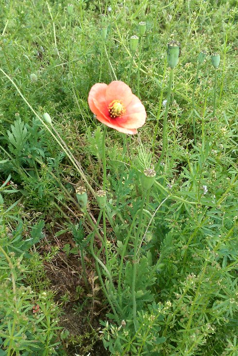 朝から新田地区の肥料まき。3時ごろまでかかって40袋を散布した。そのあと寺のウネ地区にも撒いた。寺のウネ地区にはイヌムギが腰丈以上に伸びていたが除草は肥料を撒いたあとにすることにした。ここには10袋ほど。昨日買った肥料の半分を撒き終えた。今晩から雨だ。雨の前に肥料を撒くのが効率がいい。今日の一枚はナガミヒナゲシ。薄いオレンジ色の花を咲かせている。まわりにあるのは花が散ったあとの実で中に種がいっぱい入っているらしい。ナガミの意味は実が長いからだとか。ケシとはいってもアヘンにはならないようだ。
