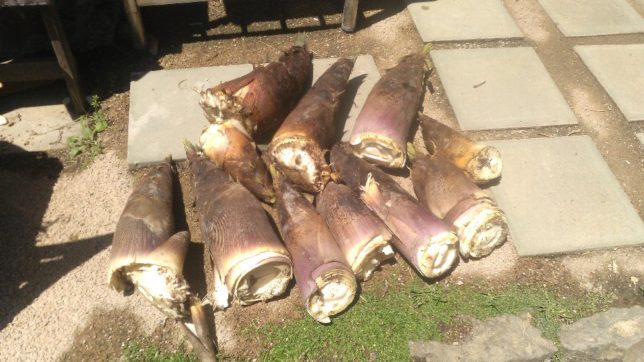 朝、まだ雨が少し残っていた。宇和ゴールドのジュースのラベルを作成。美術の才能はまったくないのはわかっているが、なんとかやっつけてジュース製造元の愛工房にプリントを依頼した。賞味期限や製造元の表示が必要なのでいつも依頼している。そのあと、午前中は2回目のタケノコ掘りに行司が谷の南西園地に行った。昨日の雨のあとなのでいっぱい出ていた。雨後のタケノコだ。収穫したのがこちら。