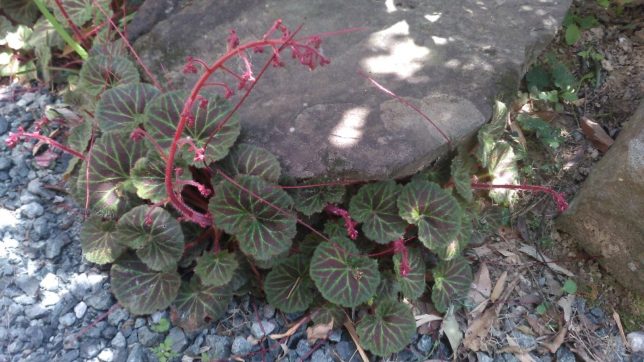 今日も除草剤散布。午前中に行司が谷の東斜面の半分を終了。最後に、モノレールのエンジンがかからなくなった。農機センターに電話したのだが今日は休日だった・・・。あと半分の作業はあきらめて午後は同じ東斜面の道上部の除草剤まきをやり、終了。明日はお休みにしようと思う。休暇も大事だ。今日の一枚はユキノシタ。中庭の池のまわりにひっそりと生えている。赤い茎が伸びてきているがこれから白い花が咲くようだ。赤くて細い糸状のものはランナーで、これが地面に根付いて新しい株になるらしい。地味で渋い植物だが、日本庭園の池のまわりにはよく植えられているようだ。そういえば鎌倉に雪の下という地名もあったが、なんとなく鎌倉文化が匂ってくる気がする。葉は天ぷらやおひたし、生薬になるそうだ。