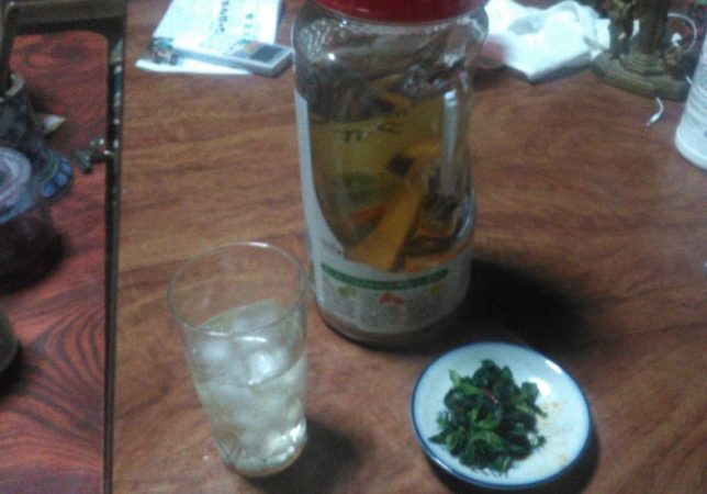 今日の一枚はまつたけ焼酎。近所の方が自分は飲まないからと、持ってきていただいたが、これがうまい。たぶん35度のホワイトリカーにおおきなマツタケを二つに割ったのが半分ドンと入っている。マツタケの香りがほどよく焼酎に移っていてヤバイ。右のつまみは高菜の一夜漬け。家で飲むのもいい。