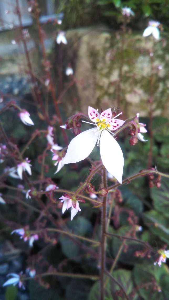 さいごにユキノシタの花の写真を。伸びていた赤い茎の先端に小さなきれいな花がさいている。奥方がスマホで撮ってくれた。