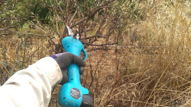 雨は上がったが、まだ園地はぬかるんでいそうなので午前中は旧倉庫の片づけをした。先日撒いた肥料の袋や豪雨災害の時に被害があったスプリンクラーの残骸の整理など。(だいぶ放っておいた)午後は寺のウネ地区の枯れ木の伐採作業をした。8本ぐらい枯れてしまっている。チェーンソーで木を切るのは簡単なのだが、その後始末が大変なのだ。その場で焼いたり、捨て場までもっていく場合もある。ここの場所は細い枝は細かく切って園地に撒き、太いのは30cmぐらいの長さに切って薪にすることにした。細い枝を細かく切るのに今年初めに買った充電式剪定ばさみが活躍してくれた。