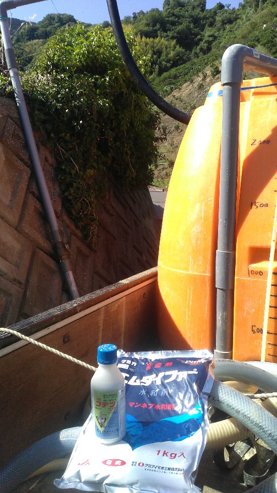 左がコテツでサビダニなどダニ系の殺虫剤。右がエムダイファーで黒点病対策用の殺菌剤だ。今日一日スプリンクラーで農薬を散布した。スプリンクラーを設置している園地の半分が終了した。