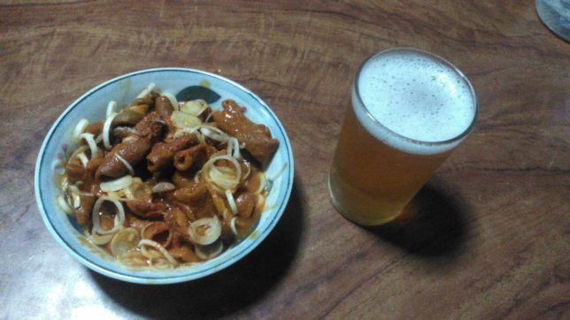 まる一日傾斜地を登ったり降りたりしていたので正直くたびれた。仕事あがりのビールのあてだが、今日はモツ煮込みだ。モツ煮は宇和島のダイレックスで買った袋入りの品。ネギをトッピングして、七味を振った。
