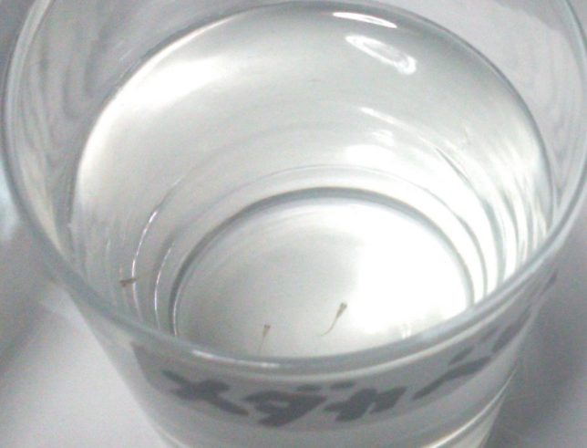 奥方が、金魚鉢のメダカを金魚にたべられないようにコップにすくっていた。写真に写ったようだ。生き延びてくれるかな。