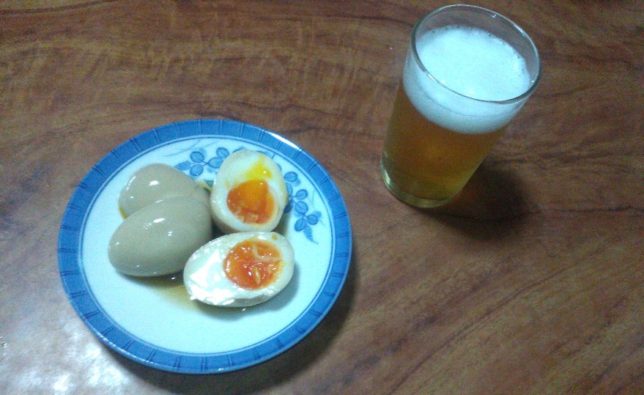 今日のビールのあては、煮卵。奥方が作ってくれた。一晩おいて、たれの味がしみている。茹で加減も半熟でおいしい。