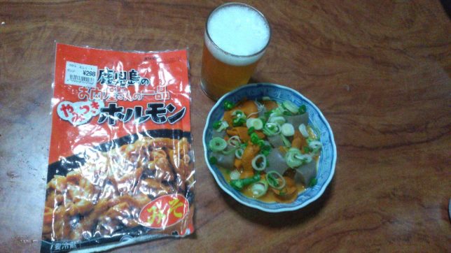 今日のビールのあては、またモツ煮だ。北宇和島のダイレックスで買った税込298円の鹿児島のやみつきホルモン(みそ)に少し水を足して、今回はこんにゃくと一緒に煮てみた。少し煮る時間が少なかったのかこんにゃくに味がしみてないがまあおいしい。