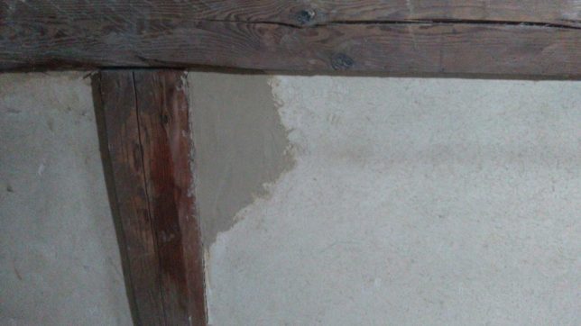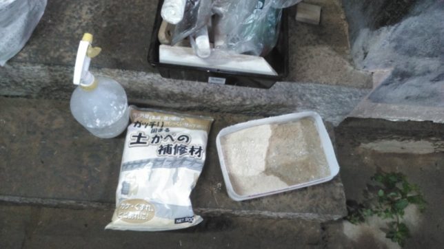 そのあとは、蔵の内壁の補修。以前買っておいた土壁補修材で剝がれたところや穴の開いているところを補修した。あとでこの上に漆喰を塗る予定。