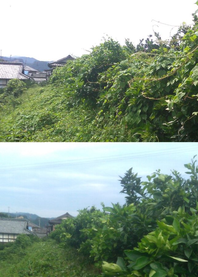 今日も新田地区の除草剤散布の続きだ。新田地区はかずらとともにアサガオが毎年繁茂するところだ。今年もあまり目につかない北側の境に植えている木にアサガオが盛大にかぶさっていた。除草剤を上からかけるわけにもいかないので、一旦除草剤散布は中止してアサガオ類(アメリカアサガオやマルバルコウ、びんぼうかずらなど)のひっぺがし作業をしばらくやった。作業前と後の比較がこちら。
