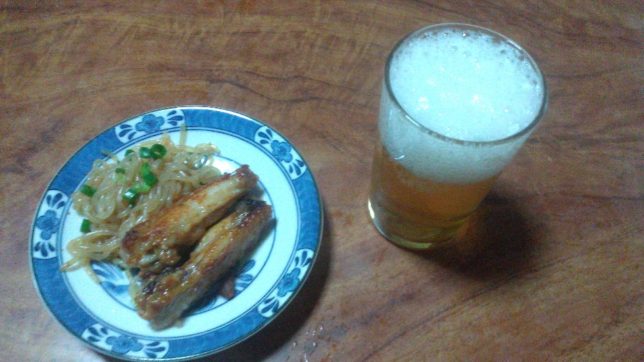 今日のビールのあては、手羽先を焼いたのと、糸こんにゃくのピリ辛炒め。