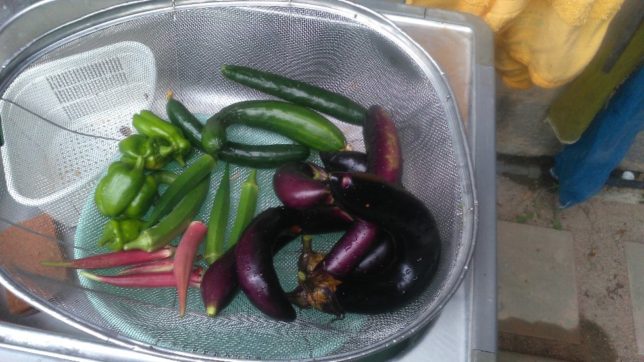 午後は旧蔵の漆喰塗りの続き。1階部分の2面終了。あと2面だ。今日の一枚は菜園の収獲物。しばらく見てなかったらいろいろできていた。