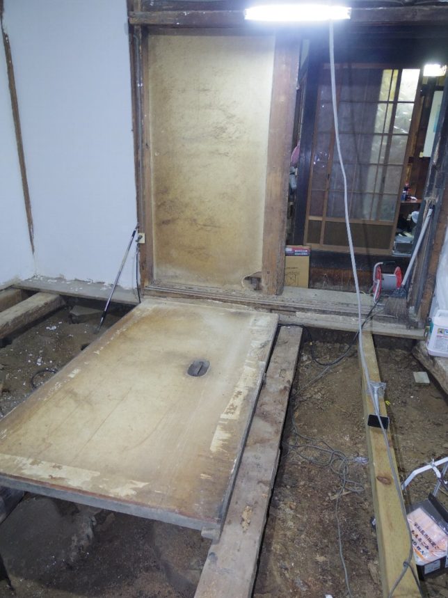 この戸の奥にもう一枚防火用の戸がある。下の写真の倒れているのがそう。この戸はいままで動かしたことがなかった。戸の下に木でつくったコロが設置されているのだが、ゴミで動かなくなっていた。戸の表面には壁と同じような構造で竹の編んだのに土壁材が塗られて、その上に2,3mmの漆喰が塗ってある。すごく重い。やっとのことではずした。この戸に隠れていた後ろはいつもの土壁が現われた。また漆喰塗りをしなければいけない。