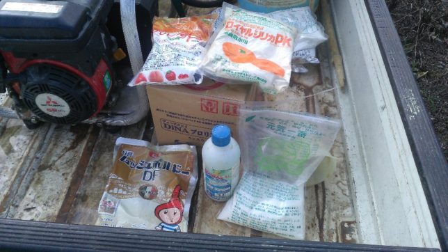 台風10号が来る前に中断していた農薬散布の続きで、今日は新田地区のブラッドオレンジと、行司が谷の紅マドンナ、和田地区のレモン、デコポンの農薬散布を行った。使った農薬や液肥が次の写真だ。