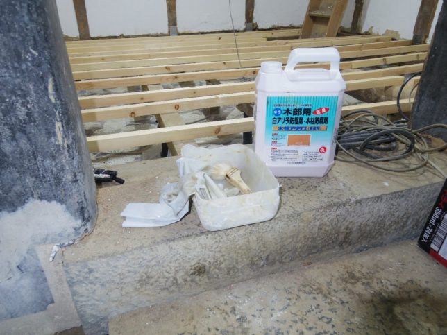 次に、根太用の45mm角の角材を切って並べていって寸法の微調整。そのあと、これもAmazonで買っておいた材木用シロアリ予防駆除・木材防腐材を塗布した。オレンジ色できれいだ。
