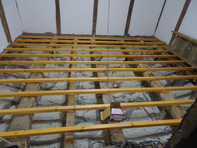 最後に90mmのビスと、床張用接着剤を使って根太を大引に固定した。
