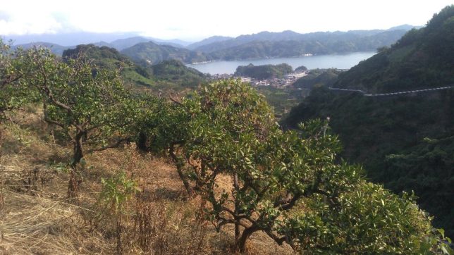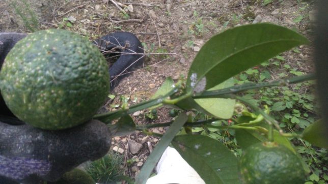 一区切りついたが、まだ時間があったので同じ行司が谷に一本ある黄金柑の摘果をすることにした。摘果を始めたところで、愕然とした。いままで気づかなかったのだが、木全体にヤノネカイガラムシが繁殖している。生っている実も半分以上ヤノネカイガラムシの被害にあっている。悪夢を見ているようだ。