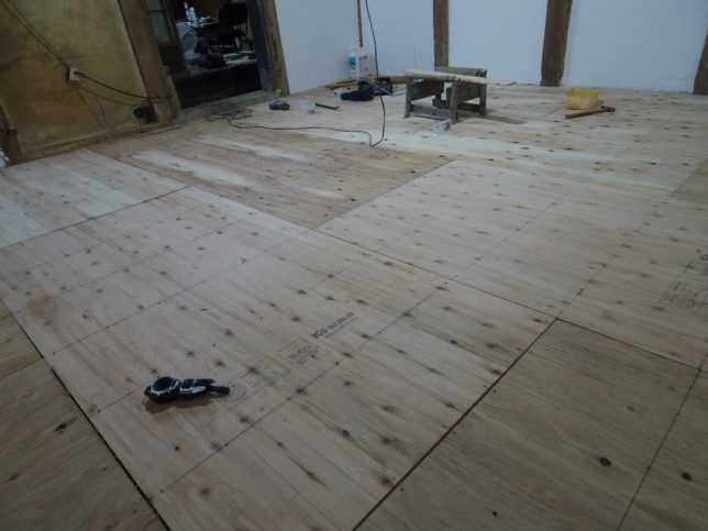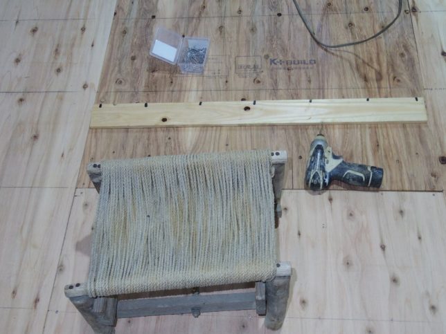 ビスはスリムビスで径3.3mm、長さは40mmにした。15cm間隔であらかじめ墨ツボで引いておいた根太の上を示す線のうえに打ち込んでいった。置いてある板はビスを打つ間隔の目印だ。先代が作った椅子が役にたった。中腰でやったら腰をやられていた。朝から午後4時ごろまで500本ほどビスを打って完成。ひと段落だ。