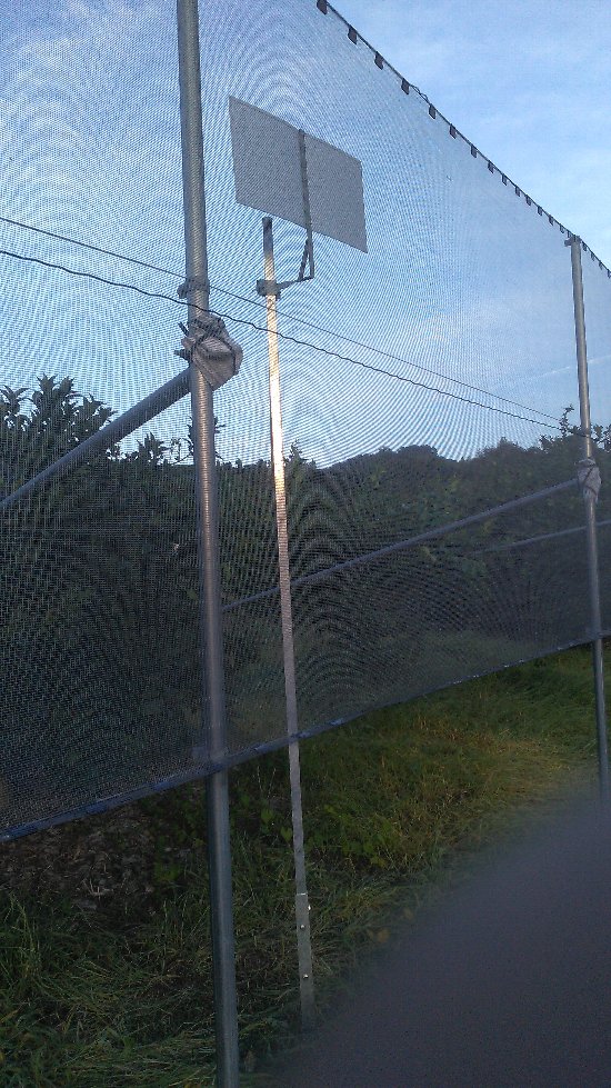 朝からいい天気だ。さわやかで秋が来たのを実感する。昼間は少し暑いくらいだがこのくらいが一番快適かも。昨日の続きでスプリンクラー工事だ。昨日支柱の下側を地面に打ち込んだのだが、今日は上側の支柱の取り付け工事を。この園地は道路(国道378号)に面していて、車の往来や散歩する人も多いので、道路沿いの支柱には農薬の飛沫を防ぐカバーを取り付けた。カバーは友人が特注で作ってくれたもの。立派なのだがかなり重くて支柱がぐらつきそうだ。すぐ外側には防風ネットも設置していて、その支柱が使えるので明日はぐらつき防止の支柱を追加することにした。