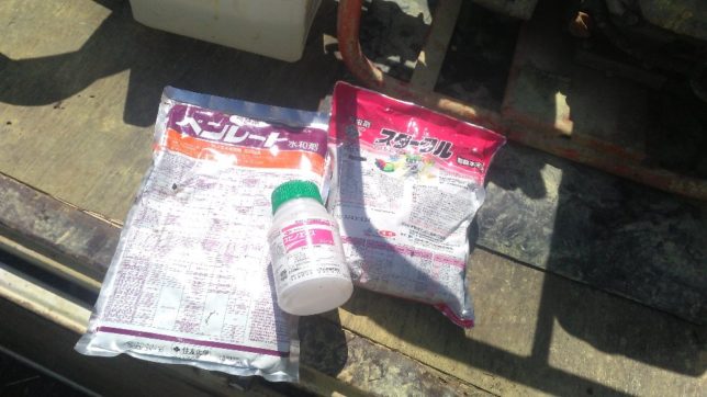 あと、行司が谷の東斜面の極早生(上野)園地に防腐剤のベンレートを散布した。収穫前に防腐剤を撒くのが組合員のお約束になっている。そろそろ収穫時期なのだが今日確認した結果は色づきがいまいち。収穫はもう少しあとになりそう。