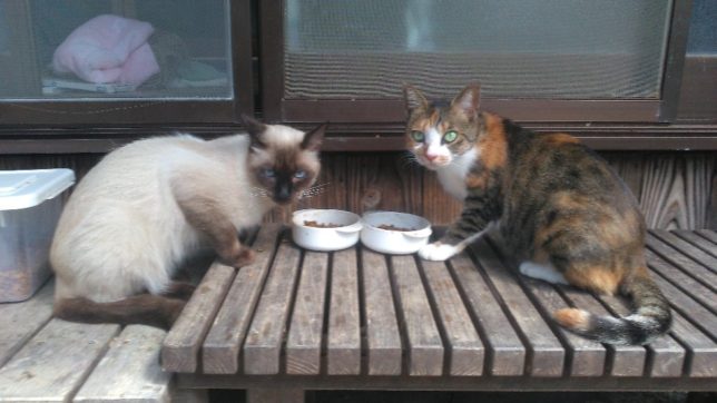 今日の一枚はココとミケのカップル。一緒に食事しているところをお邪魔した。ミケは野良猫だが、最近家の中にも良く出入りするようになっている。四匹目の飼い猫になるかも。