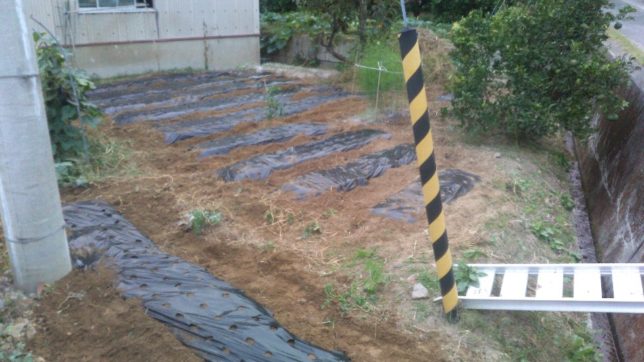農作業はお休み。旧倉庫横の菜園の整備をした。昨日購入した牛糞堆肥を撒き、石灰と有機入り肥料を撒いたあと、耕運機でかき混ぜた。そのあと鍬でうね立て作業。これが結構重労働だ。最近の家庭用耕運機はうね立て作業もできるようだ。うね立て作業のあと、穴開きマルチを敷いた。無精者には雑草取りが省けていい。