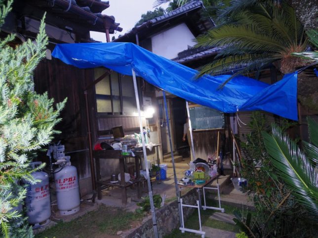 さて、今日のリフォームだが、今晩雨が降り出している。台所が使えないので外の流しを使っているが雨が降ると濡れてしまう。そこで午前中にブルーシートとスプリンクラー用の支柱を使って雨対策を実施した。