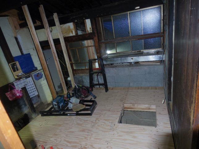 今日のリフォームの進捗だが、入り口近くに柱が設置されている。そして床には床下収納用らしき穴が。