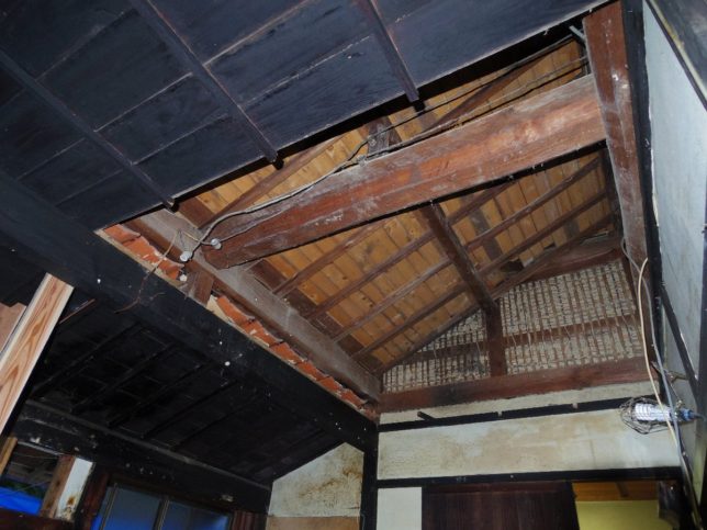 そして天井を見れば、台所の上だけ自慢の燻された黒光りする天井板が外されていた。天井上の太い柱を初めて見た。