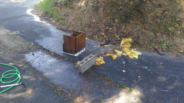 今日の朝一番はスズメバチの掃討作業。シオカラ地区の我が園地に誰かが勝手にミツバチの箱を設置しているのだが、それがスズメバチにやられてしまって、スズメバチが頻繁に出入りするようになっている。すぐ近くで水害でやられた道路の復旧工事を建設会社がやっているのだが、工事の邪魔になると連絡があった。当初、宇和島市に駆除をお願いする方向で建設会社にお願いしていたのだが、どうも交渉は不調に終わったようだ。結局、共同でスズメバチの掃討作戦を開始した。殺虫剤の農薬を動噴で巣にかけながら殲滅することに。殺虫剤はネットで調べてスミチオンが良さそうなので購入。スズメバチ対策でカッパやヘルメットなど重装備の上、農薬を巣箱にかけた。ミツバチはすでにいない状態。蜜のあるおいしそうな巣は残っていた。スズメバチは農薬でどんどん死んでくれた。黄色いのはミツバチの巣だ。